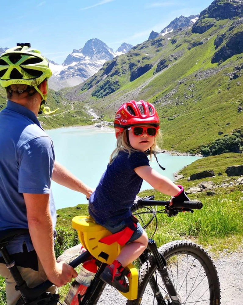 - Fixation sur le tube supérieur – l’enfant est assis en toute sécurité entre les jambes du parent qui fait du vélo.